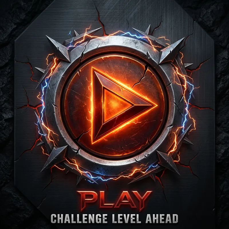 Illustrate a play button designed to intuitively suggest to the player that the upcoming level is challenging. The button should be surrounded by visual elements that hint at the difficulty like sparks, jagged lines, or intense colors to create a sense of high tension and challenge.