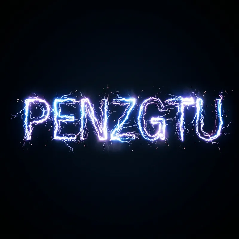 Render the word 'penzgtu' appearing as if made from high voltage electricity. The scene is completely minimalistic with no unnecessary objects, just the electrified text against a background.