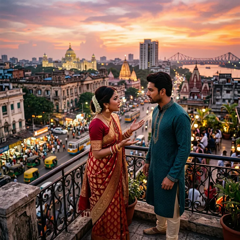 A scene showing characters in a typical plot of a Hindi movie. A South Asian woman in a beautiful traditional saree is engaged in a passionate conversation with a South Asian man dressed in a traditional Kurta. In the background, there's a vibrant and bustling Indian cityscape, with historic and modern architecture mixed. The sky is a beautiful blend of orange, pink, and purple, indicating sunset. People around them are busy with their daily lives, creating a lively atmosphere.