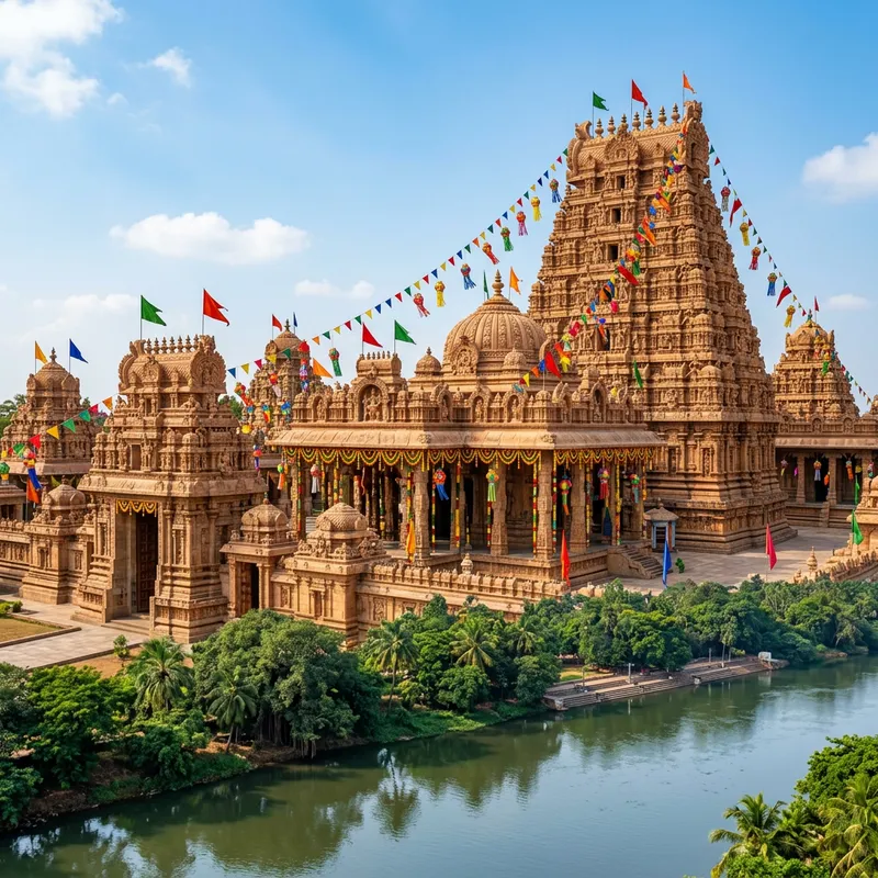Visualize a grand Hindu temple, meticulously constructed out of sandstone and covered with intricate designs. Depict multiple tiers of the pagoda-like structure under a clear blue sky, reflecting the festivity of a traditional temple festival. Elaborate decorations of multicolored flags and lanterns hang from the ornate rooftops of the temple, swaying with the cool breeze. Picture lush green trees and a serene river flowing nearby, adding to the tranquility and sacredness of the location. Make sure the scene is devoid of people, focusing entirely on the stunning architecture and vibrant festival decorations.