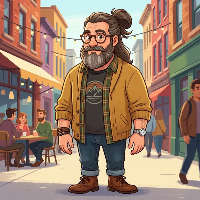 A cartoon-styled image of a man with a full beard, featuring shades of grey and brown. His long hair is tied back in a traditional ponytail, embodying a classic hipster look. His complexion is robust, suggesting a rich scene of urban life. His clothing mirrors his eclectic tastes commonly associated with hipster culture.