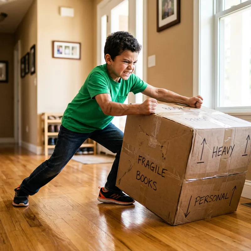 A Hispanic boy with short, dark hair is exerting his strength to push a sizable brown cardboard box on a shiny wooden floor. The boy is wearing a vibrant green t-shirt and denim jeans. His eyebrows are furrowed in determination, his fists are clenched, and his muscles are straining as he attempts to move the box. The box is taped shut and appears to be filled, hinting at its weight. The lighting is bright and warm, illuminating the scene and the box's sharp edges.