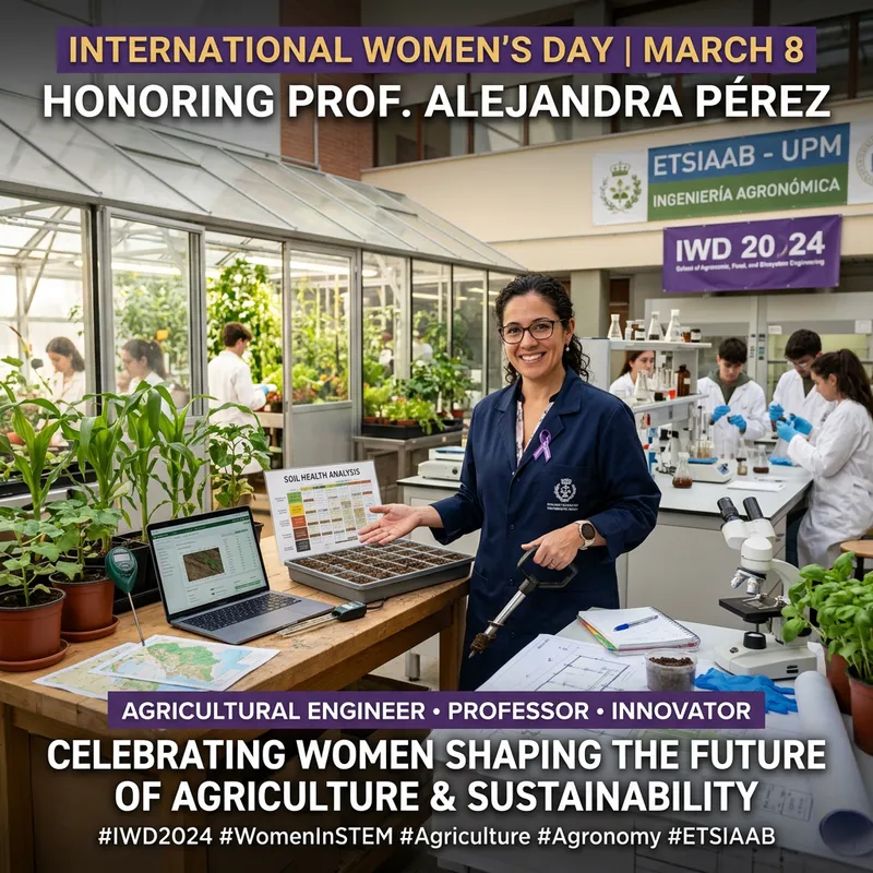 Create an image in honor of International Women's Day on March 8th, featuring a Hispanic female professor who is an agricultural engineer. She should be depicted in a professional setting, surrounded by tools and elements characteristic of her field like plants, soil testing equipment, and blueprints. In the background subtly incorporate symbolic aspects of a typical school of Agronomic, Food, and Biosystem Engineering, such as labs, classrooms, or greenhouses. The image should fit the Instagram story format.