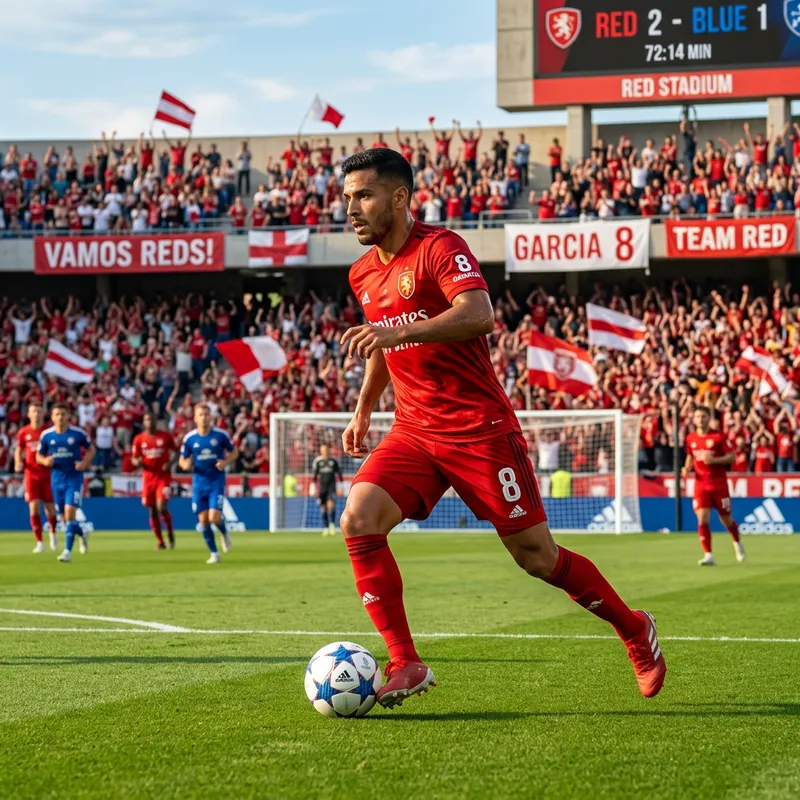 A professional football player wearing a radiant red uniform with the number 8 prominently displayed on the jersey. The player, of Hispanic descent, is skilfully controlling the ball on a meticulously groomed football pitch. The sun is shining, casting a warm light on the scene, and spectators in the background are cheering on their favorite team.