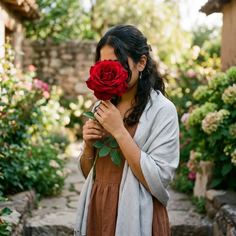A modest girl of Hispanic descent, wearing an earth-colored dress and a silver shawl, holds a vibrant red rose up to her face, obscuring it from view. The petals of the rose seem soft and velvety, its color contrasting with her dress and shawl. Her pose exudes a sense of demureness and innocence.
