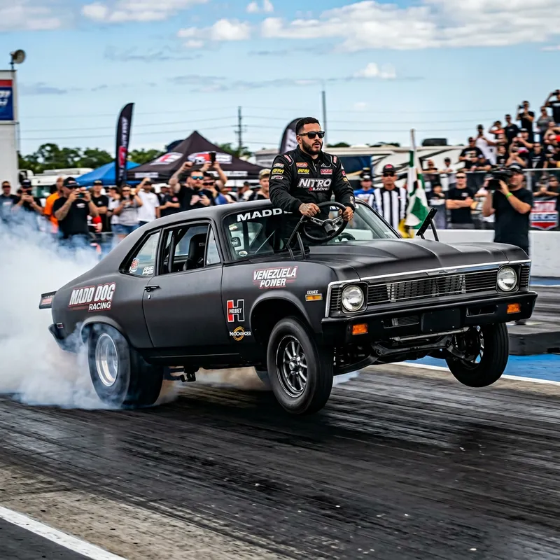 A Hispanic male driver performing a wheelie with his car
