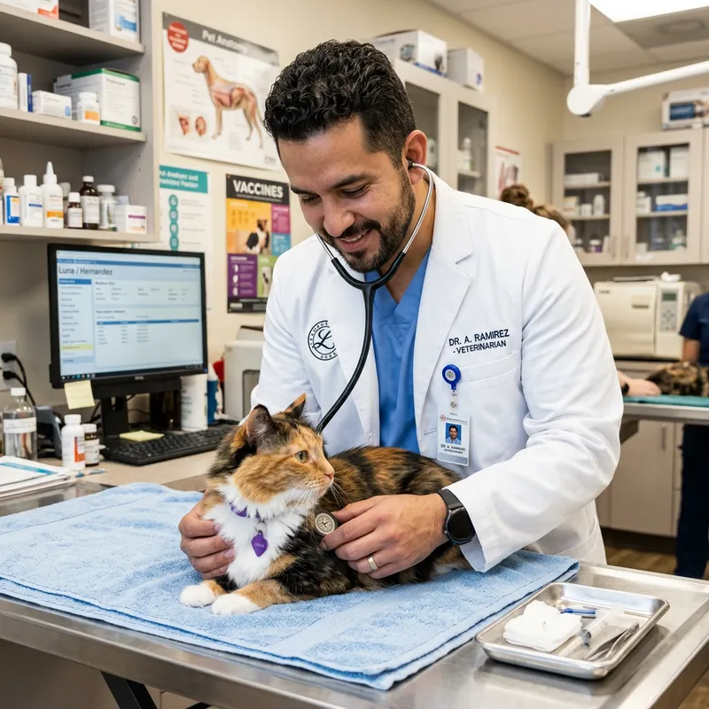A Hispanic male veterinarian in a white coat, attending to a calico cat on an examination table in a well-equipped vet clinic. The veterinarian has a caring look on his face as he listens to the cat's heartbeat with a stethoscope.