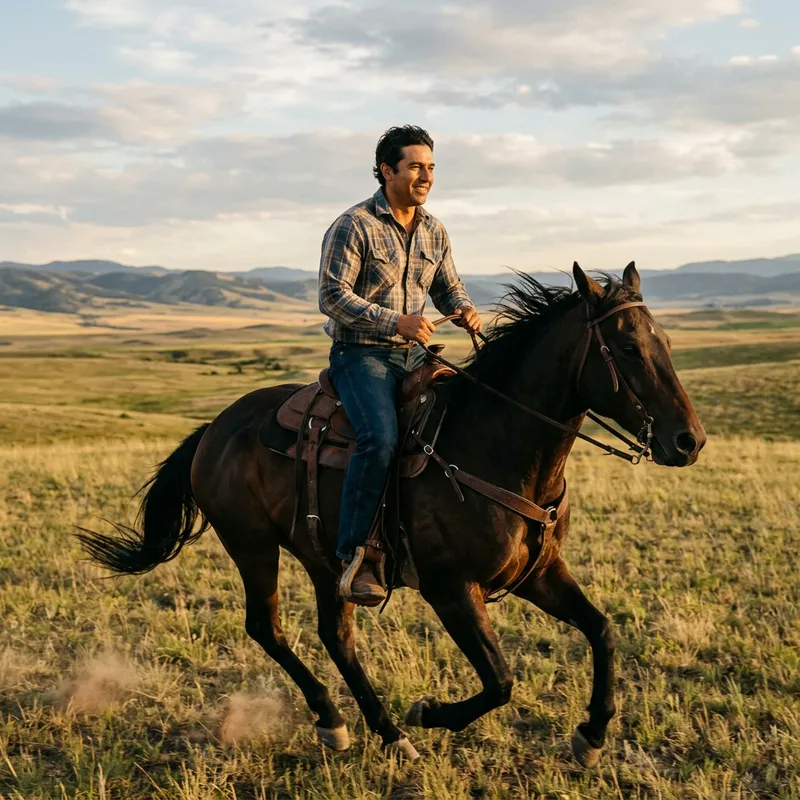 A Hispanic man, distinguished by his dark hair and tan skin, actively riding a majestic horse. He is confident and focused, skillfully guiding the horse with ease, displaying a strong bond with his equine companion. The landscape around them is vast and open, the wind ruffling his clothes and lifting the horse's mane. He appears to be at one with nature, embodying a sense of freedom and adventure. The horse beneath him is strong and agile, its muscles flexing powerfully with each stride, as they both cut a striking figure in the waning sunlight.