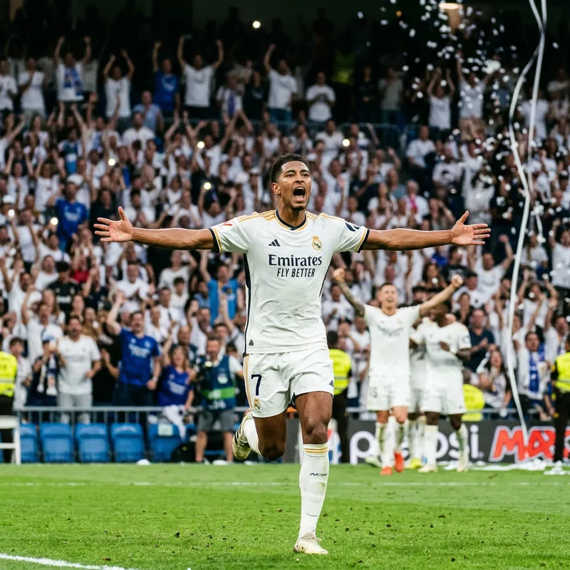 An athletic Hispanic soccer player with the number '7' emblazoned on his uniform for a well-known soccer club, striking a triumphant pose, arms outstretched, yelling 'siiiiiu' in exhilaration after a successful goal. The atmosphere around him is electric with the excitement of the cheering crowd.