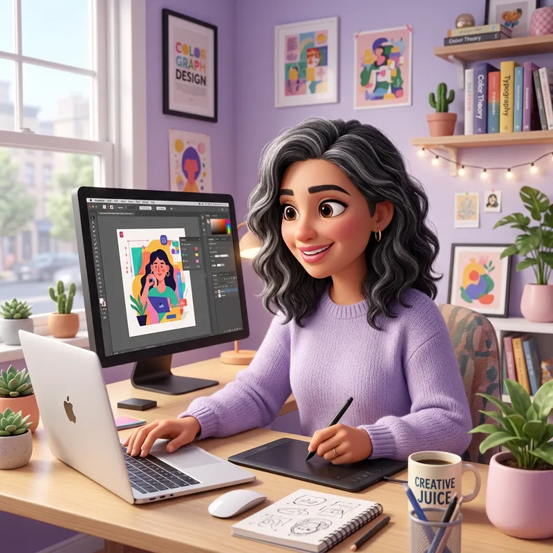 Generate a Pixar-like animation of a Hispanic woman with a career as a graphic designer. She has shoulder-length, wavy, salt-and-pepper black hair, and a rather prominent nose. She possesses white skin, black eyebrows, and plump pink lips. She is seated at her desk, working on a white laptop beside a large black monitor. Her office is decorated in pastel violet and pink tones. Her eyes are deep brown.