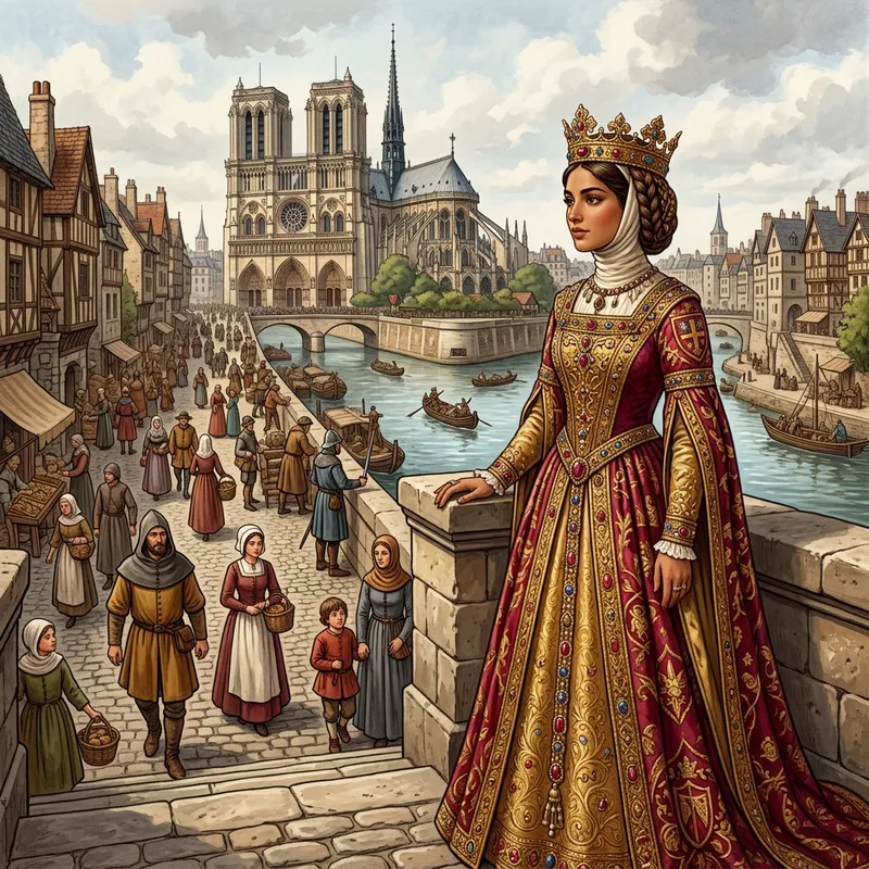 Detailed illustration of a young princess of Hispanic descent, dressed in High Middle Ages attire, standing gracefully on a bridge overlooking the Seine river in Paris. She is wearing a lavishly embroidered gown, typical of the period, adorned with a regal crown. The Notre-Dame Cathedral stands majestically in the distant background. Around her, the historical streets of Paris bustle with people of various descents and genders going about their day-to-day activities.
