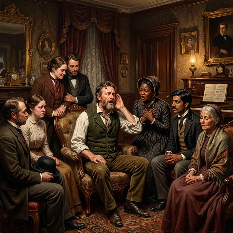 Illustrate an historical scene set in an ornately furnished vintage room. In the center of the room, a man sits with one hand cupped around his ear. He is deeply engaged in a melodic song, a look of passion upon his face. Gathered around him, people of various descents and genders, cloaked in period attire, watch him perform, their faces mirroring his emotional intensity.