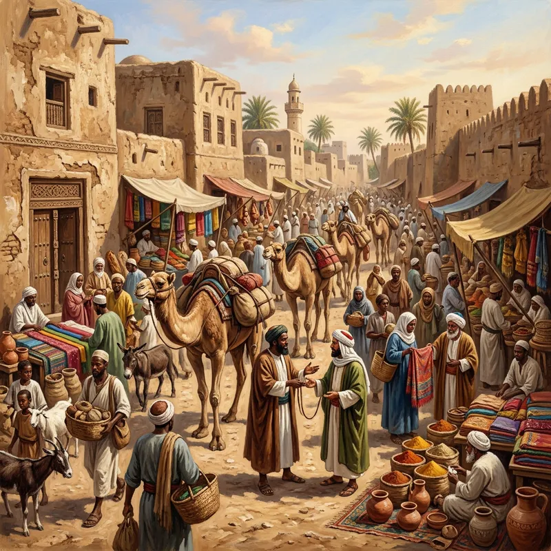 Illustrate a historical representation of business in Somalia. Show a bustling marketplace from a few centuries ago, where vendors of diverse descent sell goods such as textiles, spices, pottery and more. Exhibition of trading camels inside the busy street, people bargaining, and exchanging goods. The architecture should hint towards ancient Somali style, mud brick buildings with flat roofs and wooden doors.