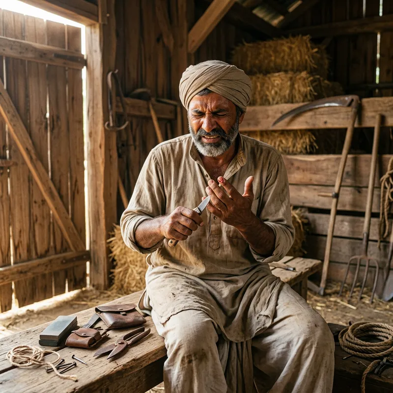 Create an emotional scene of a historic farm worker of an unspecified era, who happens to be a South Asian male, wincing in pain as he accidentally cuts his finger while trimming his nails. The setting is an old rustic barn, and it's the middle of the day. The workman's tools for his craft lay haphazardly scattered nearby. The atmosphere is marked by intense emotion as well as the beauty of the rustic setting.