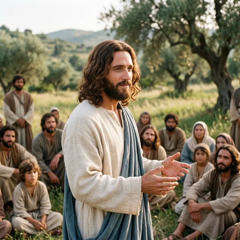 A historical figure often depicted in religious art, known for his teachings of love, peace, and humility. This man has traditionally been shown as a middle-aged man with long, wavy chestnut hair, a beard, and compassionate eyes. He is often portrayed wearing a simple robe. This figure is also frequently depicted with a serene expression, perhaps in the middle of delivering a sermon or imparting wisdom to his followers.