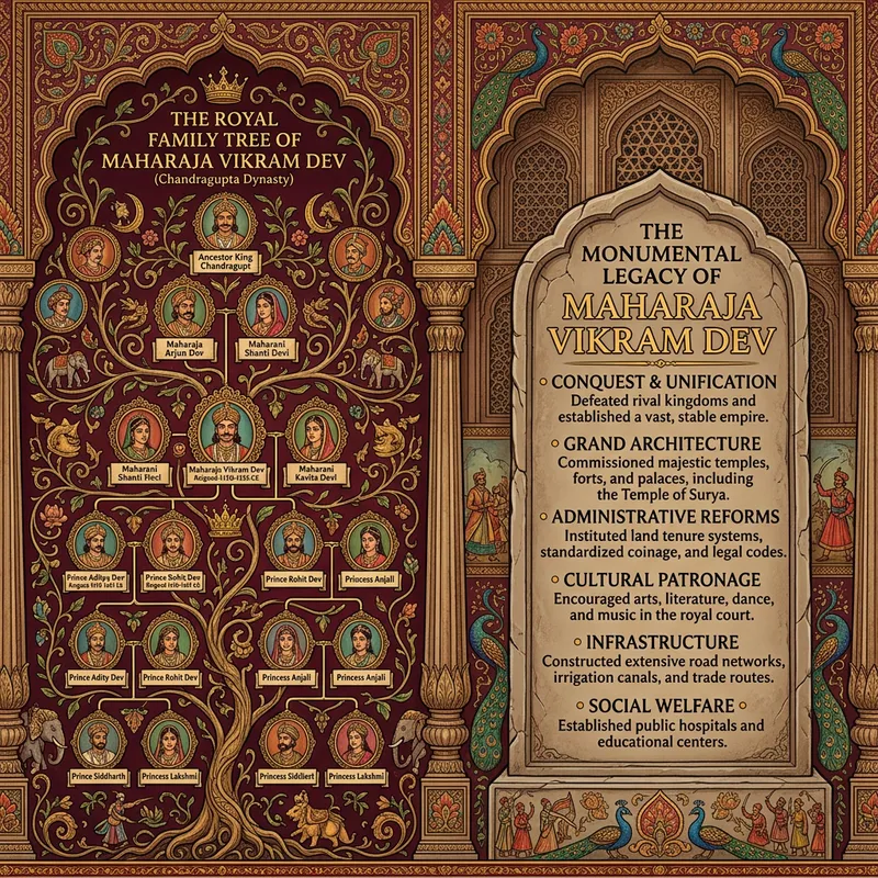 Embark on a journey into the fascinating reign of a historical Indian ruler. Roam within the intricate tapestry of an illustrated royal family tree, tracing lineages that intertwine with history. Take your time to examine the monumental legacy left by this influential figure on a stone tablet that presents in bulleted format, significant events and contributions. Imagine the vastly detailed hand-drawn depictions and ornate designs, all on a backdrop of deep maroons and gold. Let elements of traditional Indian culture and architecture, like arched doorways and intricate patterns, frame this scene.