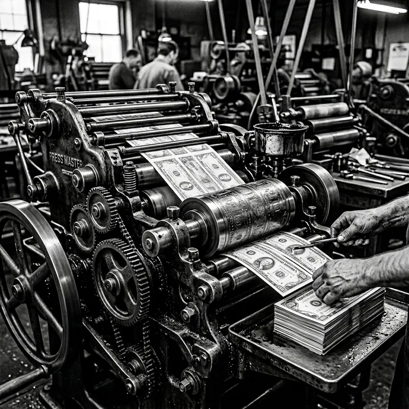 An intricate black and white, high contrast, 8k resolution image close-up of a historical printing press in operation, producing money. The image captures the precision, rigidity and mechanical process of the press, showcasing the fine detailed workings. This image is inspired by the style of traditional documentary photography, similar to the impactful imagery found within National Geographic photography.