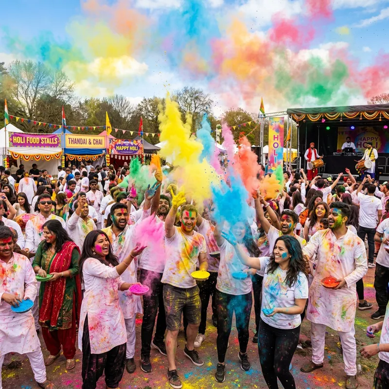 A lively scene of the Holi festival, the Indian festival of colors. The atmosphere is vibrant and cheerful. There is a diverse crowd of people - South Asian men and women, Caucasian participants, Middle-Eastern individuals, and Hispanic onlookers. They all have joyous expressions on their faces as they throw color powder into the air. The sky is a kaleidoscope of yellow, blue, pink, and green from the airborne powders. In the background, there are tents hosting food stalls, traditional music is playing, and the aroma of Indian cuisine floats in the air.