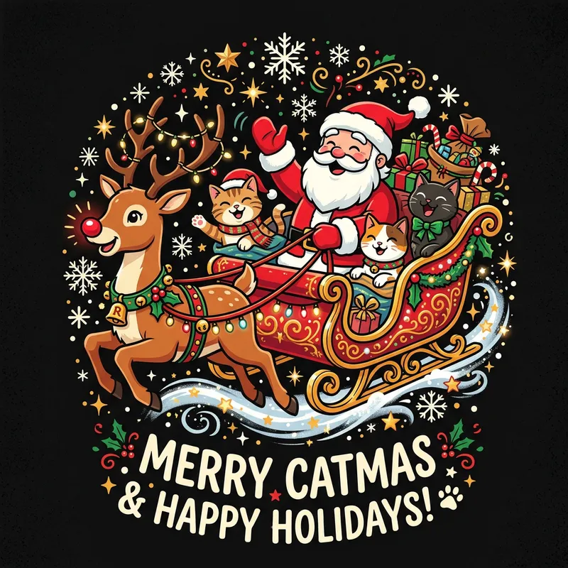 A joyous and celebratory vector graphic illustration featuring a red-nosed reindeer leading a beautifully adorned sleigh with a jolly plump man in red attire and three cute cats. All inhabitants are seen to be having a merry time. The art piece is isolated on a sophisticated black background, accentuated by bold and neat stroke lines to enhance the digital illustration style. The composition is thoughtfully crafted, making it suitable for T-shirt printing, with the main subjects positioned prominently against the sleek black backdrop. Embrace the holiday spirit with this enchanting and attention-grabbing design!