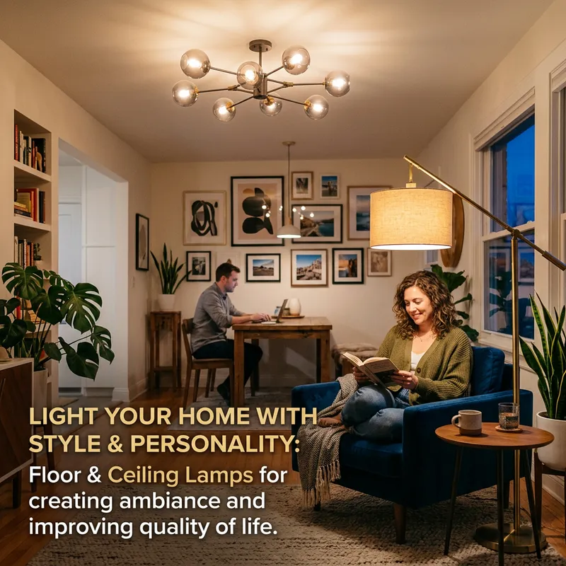 Create a photo illustrating how to light your home with style and personality through the use of floor and ceiling lamps. Show how lighting can create different atmospheres and improve your quality of life.