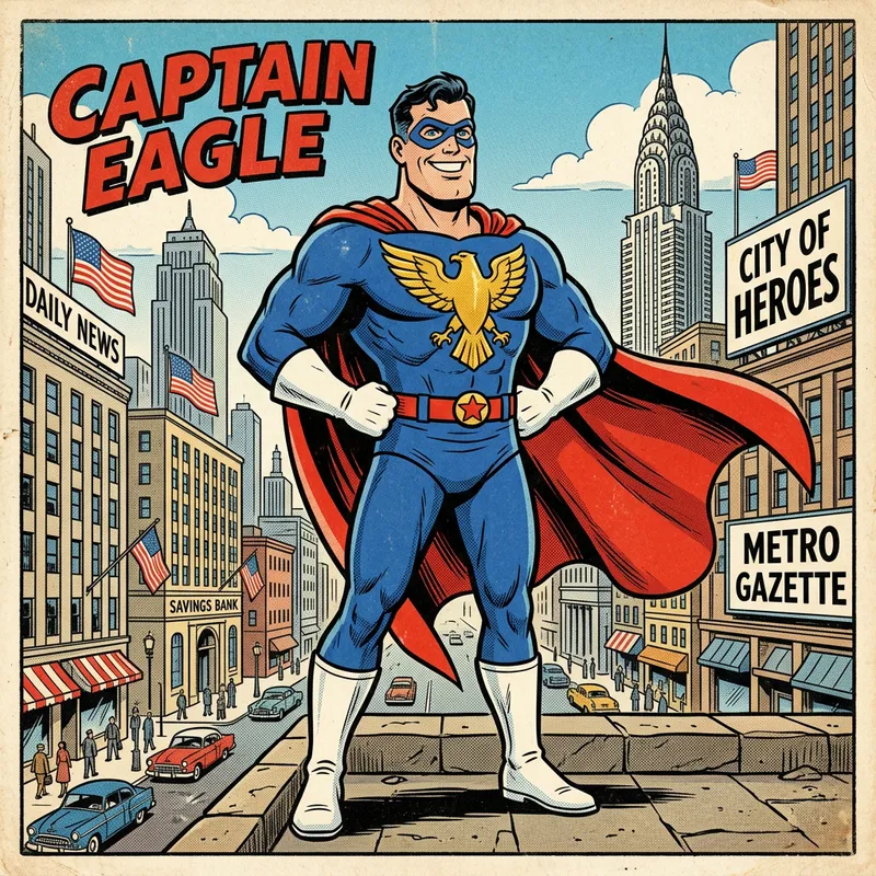 A cartoon character resembling a superhero who takes his design cues from the aesthetics of 1950s comics and advertisements. This character should exhibit an innocence and optimism indicative of the era's ethos and should be outfitted in patriotic attire, complete with a red cape, a blue suit with a golden eagle emblem on the chest, and white boots. The character should be posing confidently, evoking an air of authority and leadership.