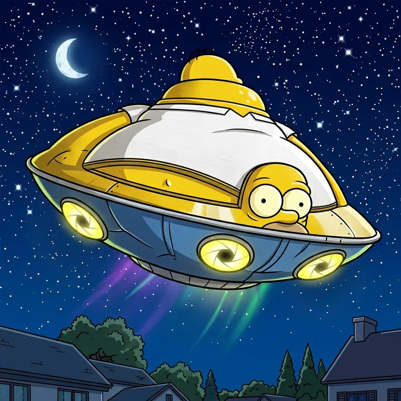 A typical yellow-skinned, bald cartoon character with a protruding belly and wearing a white shirt and blue pants is depicted as a UFO. The character's body morphs into the shape of a classic flying saucer, smoothly integrating his clothes and physical features within the spacecraft's design. His eyes become the glowing lights of the UFO, eliciting an eerie, paranormal vibe. Meanwhile, the background consists of a clear night sky littered with sparkling stars and the radiant moon.