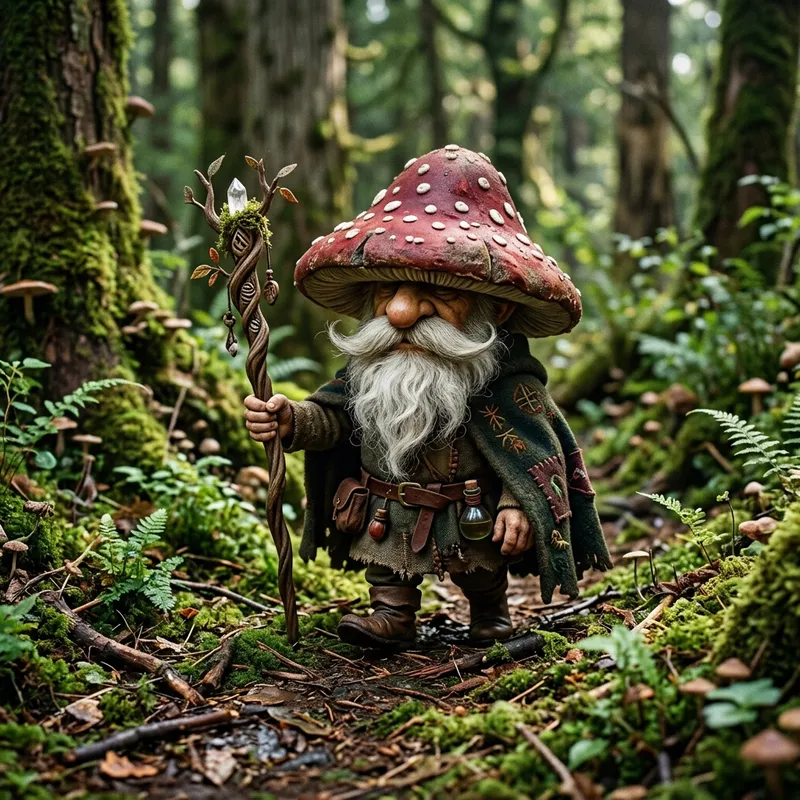 an old mustached wizard very small like a gnome, with a big nose, eyes hidden by the hat, reminiscent of a mushroom, with a branch cane
