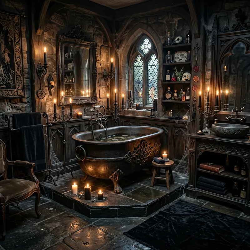 Horror-themed bathroom with a gothic cauldron style bath situated within a gothic-themed interior. The scene is illuminated by dark, moody lighting, complementing the vintage gothic furniture. This creates an eerie yet elegant atmosphere.