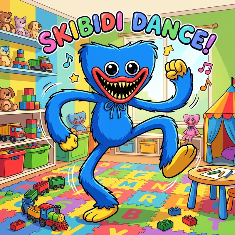 A cartoon image of the character Huggy Wuggy from the game Poppy Playtime, performing the famous dance move called 'Skibidi'. The character is designed with bright blue fur, large eyes and a wide mouth with pointed teeth. The surroundings seem to be a playful and colorful room filled with toys suggesting a children's play area.