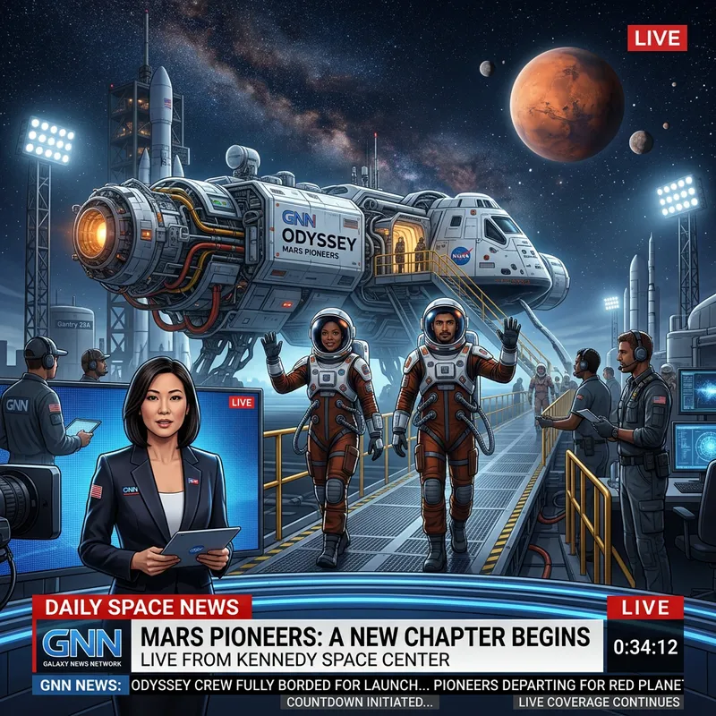 Create an image that depicts a scene from a futuristic daily space news segment. The broadcast is focusing on the story of multiracial astronauts, with both male and female members, embarking on a pioneering journey to Mars. Detailed visuals include people in state-of-the-art space suits preparing for the journey, intricate spacecraft designs, and a vivid, distant view of Mars across the star-studded expanses of space.