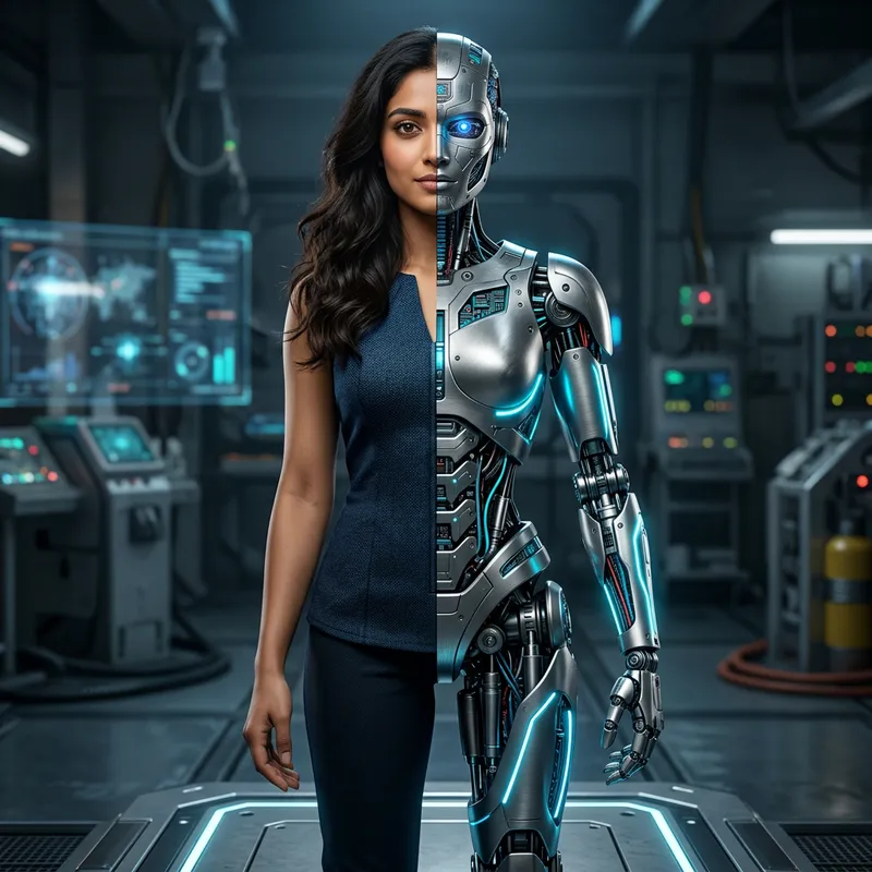 An intriguing figure that is a half-human, half-robot. On one half, features of a typical human are prominent: soft skin, expressive eyes, and flowing hair. The other half distinctly robotic, showcasing a metallic exterior, mechanical joints and glowing circuits. The humanoid part could be of any descent and either gender to emphasize diversity. The robot part is made from refined steel with accents of neon lights to highlight advanced technology. The two halves blend smoothly at the center, creating a perfect balance between biological life and artificial intelligence.