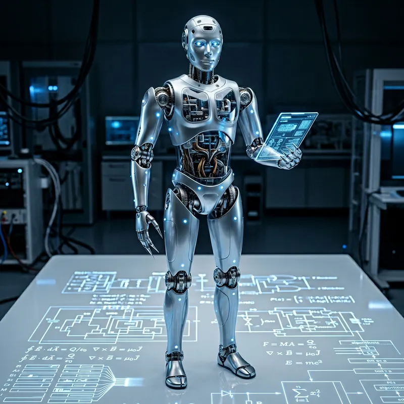 Visualize a humanoid robot standing on a white surface. The robot has a glossy metallic silver finish, with intricate wires visible through transparent sections of its chest. The robot's eyes glow a bright blue, and its fingers end in sharp, needle-like points. Small LED lights dot the robot's limbs, casting a soft bluish light. Gear mechanisms are visible around the robot's joints, and it holds a futuristic digital device in its hand. There are circuit diagrams and mathematical equations projected onto the surface around the robot, highlighting its complex computational abilities.