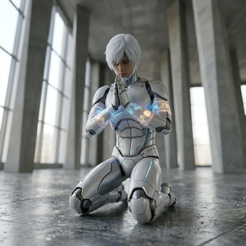 Draw a humanoid interpretation of a robotic character with white hair, sitting in a praying posture from a low-angle view, without too many details. Also, illustrate semi-floral bands on his arms.