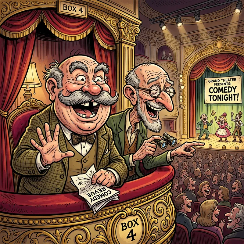 humorous caricature of two elderly men in a theater box, reminiscent of classic cartoon styles, exaggerated facial features and playful expressions, vibrant colors with bold outlines, digital illustration with a whimsical touch, comedy genre.