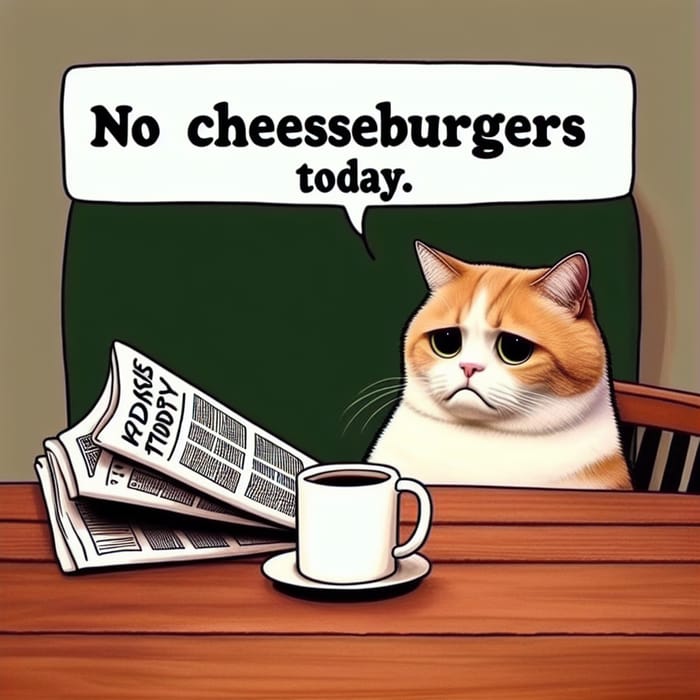 A typical internet meme featuring a humorous cartoon cat sitting at a table, with a mug of coffee and a newspaper in front of it. The newspaper has the headline, 'No cheeseburgers today.' The cat has a disappointed expression.