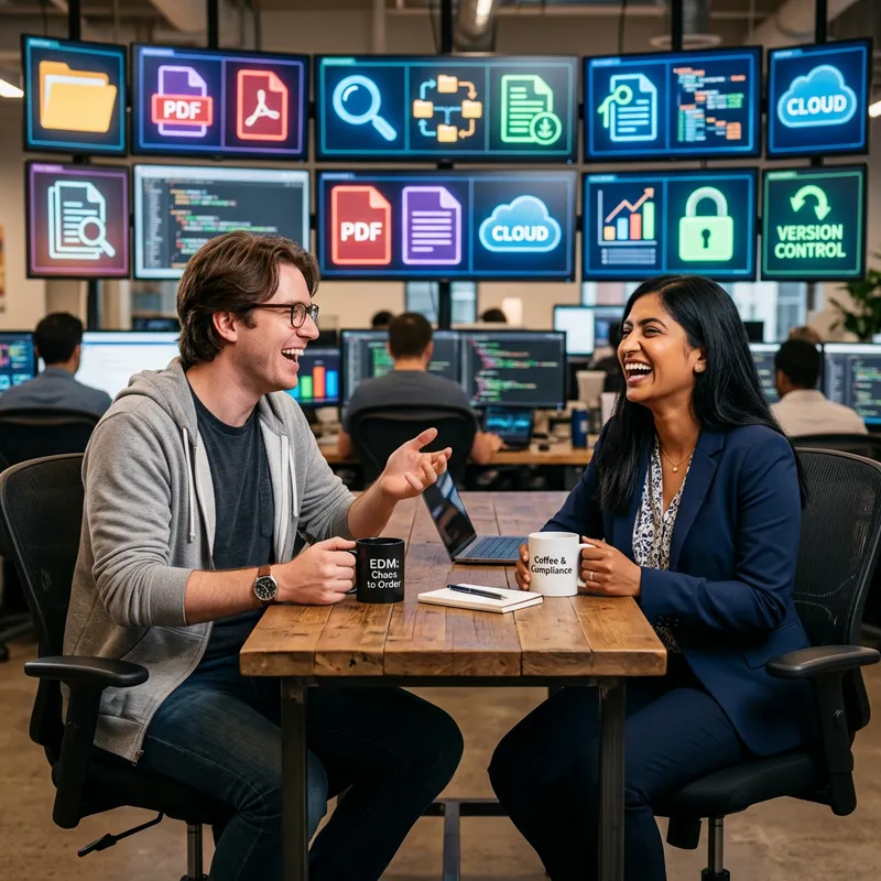 Two characters engaging in a humorous conversation about Electronic Document Management. One is a Caucasian male with brown hair and glasses, wearing casual attire. The other individual is a South Asian female with long black hair, sporting a formal office attire. They are surrounded by digital screens showing various document icons, creating a futuristic ambiance. They are laughing while sipping coffee, adding to the jovial atmosphere of the scene.