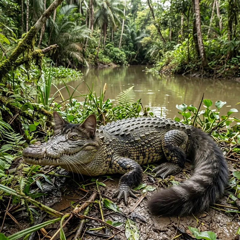 Hybrid creature: crocodile with cat features, combining the body of a crocodile with cat ears, tail, and whiskers, set in a natural habitat