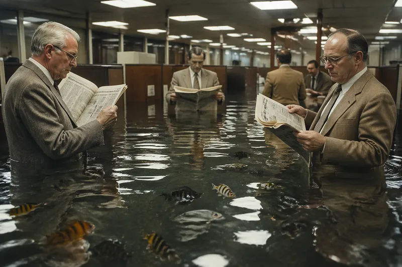 Hyperrealistic documentary photograph of a group of elderly businessmen in vintage 1970s suits standing waist-deep in a flooded office, all calmly reading newspapers while tropical fish swim around them, fluorescent ceiling lights reflecting on water, cubicles submerged, Kodak film grain, shot on 35mm, mundane yet surreal.