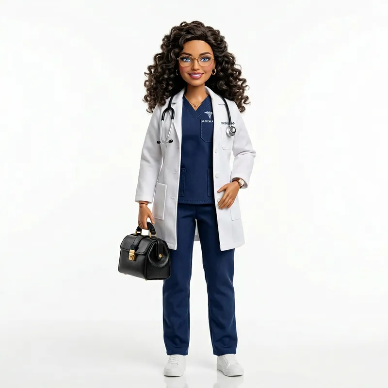 An incredibly detailed image of a curvy Latina doll inspired by the style of early 2000s fashion dolls, but not a specific copyrighted character. She has been brought to life in stunning 8K-HD detail. Her beauty is accentuated by her almond-shaped light blue eyes, full lips, and fashionable style dressed in professional medical attire. Her brown curls fall elegantly, accented by a pair of reading glasses. A sweet smile adorns her face as she holds an adorable black medical bag, set against a white background.