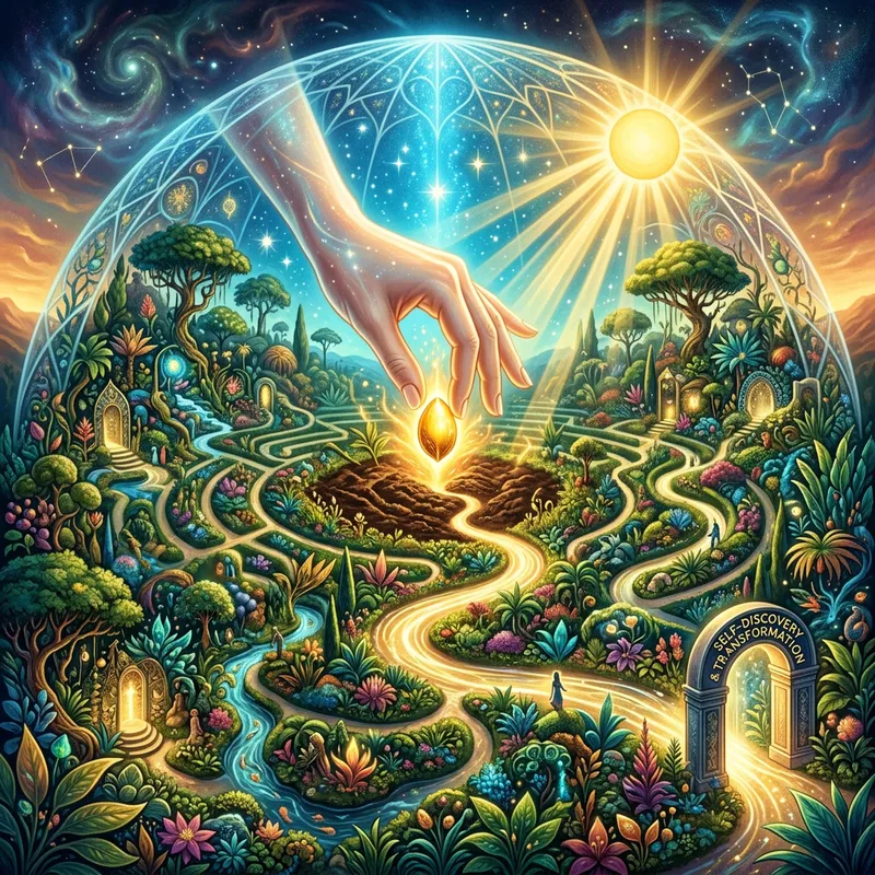 An abstract representation of the process of hypnotherapy focusing on personal growth. Picture this: the sprawling metropolis of the subconscious mind is represented as a labyrinthine garden of the mind, blossoming with flora and fauna. At the middle of this garden, a hand emerges from the cerulean sky, delicately planting a golden seed into the rich soil. This seed is glowing, harnessing the power of inner potential. Rays of light from the sun beam down on the garden, metaphorically symbolizing the external influence of the hypnotherapist. The garden is enclosed by a dome, representing the extents of the subconscious mind, and a path leading from the seed to the garden's exit symbolizes the journey of transformation and self-discovery.