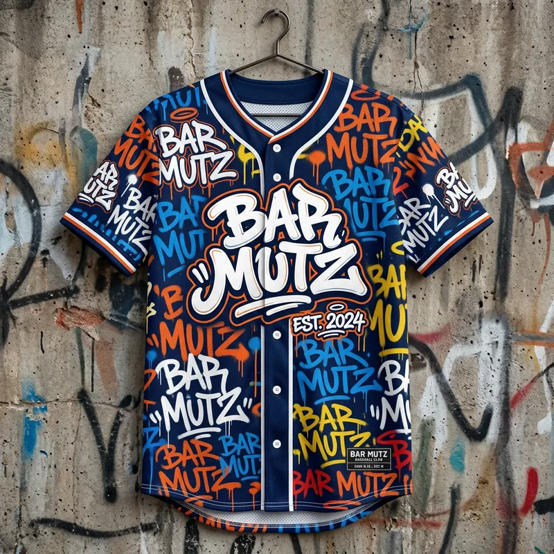 I am looking to generate a baseball jersey for our team called bar mutz. I would like the name to appear throughout the jersey in a grafiti, pop art, style. The jersey should be dark blue, the main logo in white but the background should have the name “spray painted throughout in multiple directions and bubble letters to appear as if graffiti.