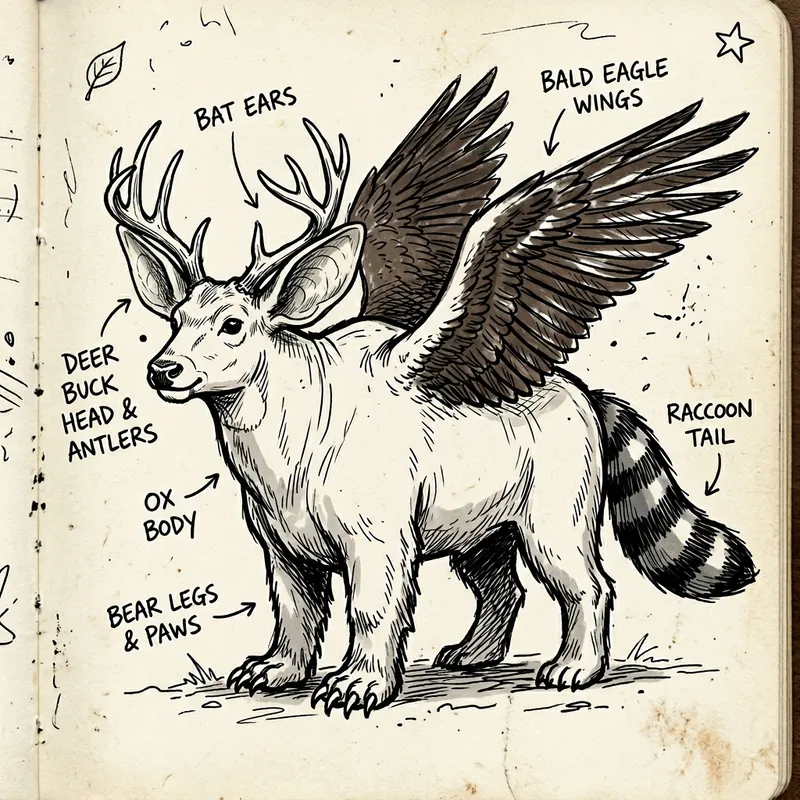 I need a simple doodle of a hybrid animal with a mix of ears of a bat, head of a deer buck, legs of a bear, wings of a bald eagle, a body of an ox, and a tail of a racoon.