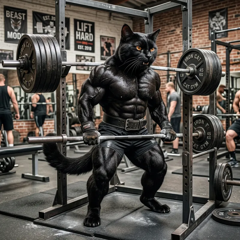 I want a big strong muscly cat that is lifting weights. I want the cat to be black.
