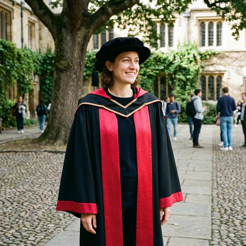 I want to add a PhD academic dress to my daily photo, including Oxford style black gown with red facing on the front of the gown and around the sleeve cuffs. Black Oxford style hood, fully lined with red, with gold edging. Black Tudor bonnet with black tassel.