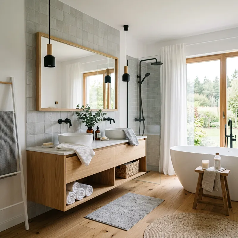 Beautiful Scandinavian Bathroom, cozy, light wood, white and gray.