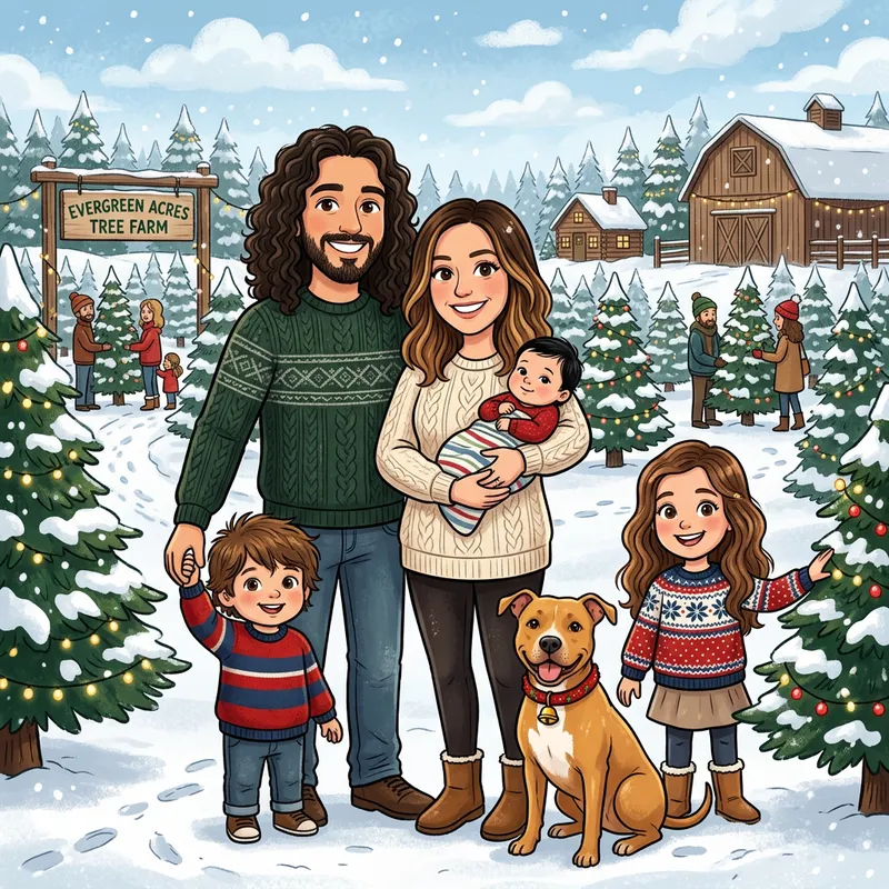 I would like to create a cartoon family. The father has long dark curly hair, the mother has brown hair with caramel highlights, the 2 years old son is brunette with shaggy hair, the 4 years old daughter has long brown hair and the 3 month old daughter has black hair. They all wear sweater and are in front of a christmas tree plantation with their golden brown American pit bull terrier.