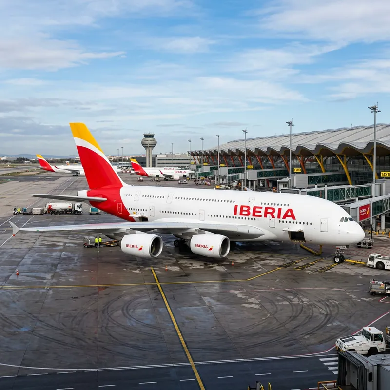 Original Prompt: Un avion A380 con librea de iberia Airlines