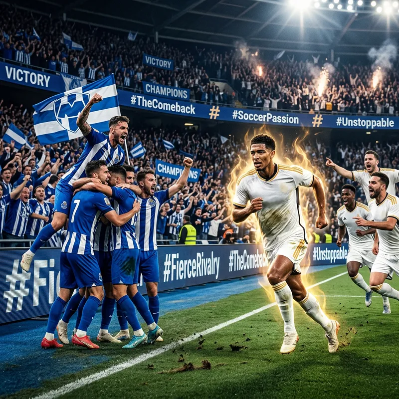 Show the fierce competition between two symbolic soccer clubs, with the first team in blue and white celebrating a win, and the second team in white and gold making a remarkable comeback. An unnamed, charismatic soccer player in the second team shines, seemingly illuminated by an inner flame, representing their exceptional performance. Showcase the energy, excitement, and dedication of each team and their players. The scene is filled with signs of victory, intense gameplay, and an unmistakable aura of determination. Include depictions of hashtag symbols, artistically incorporated into the scene, emanating the essence of the sport and these teams.