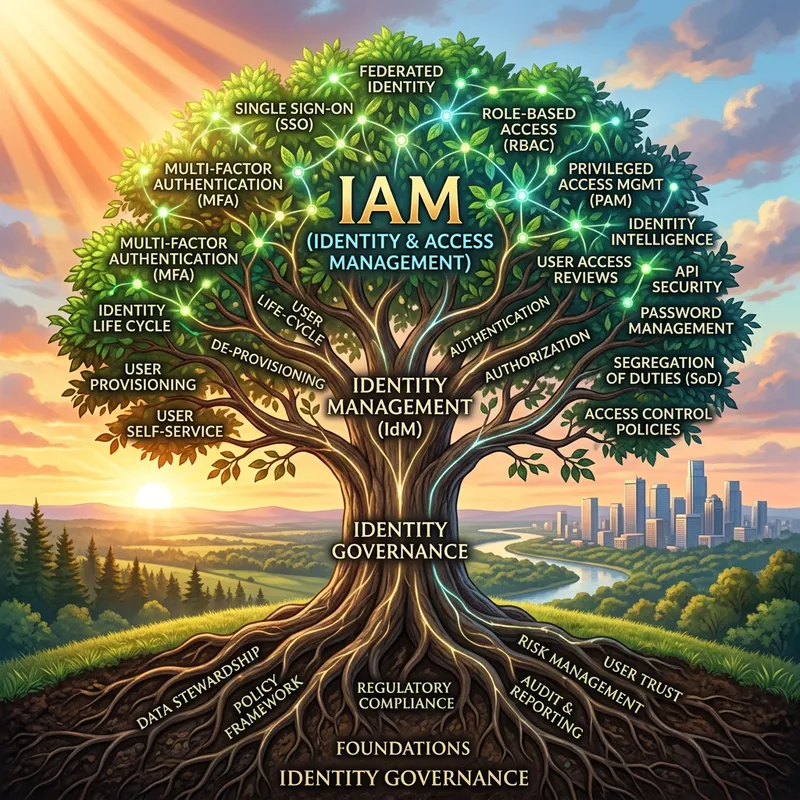 A symbolic tree showing the concept of Identity governance. From the roots, the tree develops branches depicting the growth and intricacies of Identity Management, culminating in the crown which represents Identity and Access Management (IAM). The roots, trunk, branches, and crown all demonstrate the interconnected and vital nature of these complex systems. The aesthetic of the tree is realistic with a touch of artistic flair. The colors are contrasting to differentiate between roots, trunk, branches and the crown. The rays of the sun are beaming down onto the tree, symbolic of the constant growth and evolution in the field of IAM.