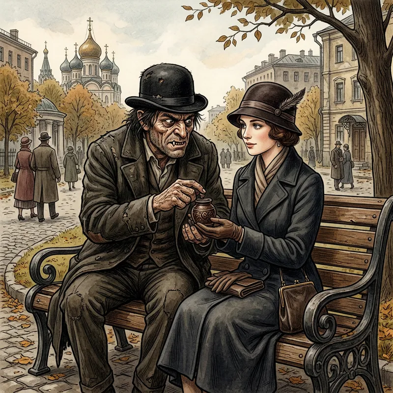 Create an illustration for the novel The Master and Margarita by Mikhail Bulgakov. The illustration is set in Moscow in the 1920s where Azazello, a character with a somewhat scary face, is giving Margarita, a young woman with a sweet face expressing interest, a small jar of magical ointment. Azazello hands over the small box with the witch's ointment to the kind and noble Margarita on a bench in early 20th century Moscow.
